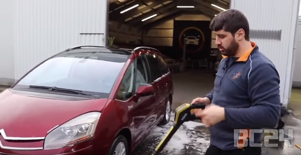 Если моете автомобиль на мойке самообслуживания, то обязательно обдайте с керхера щетку, как показано но фото.